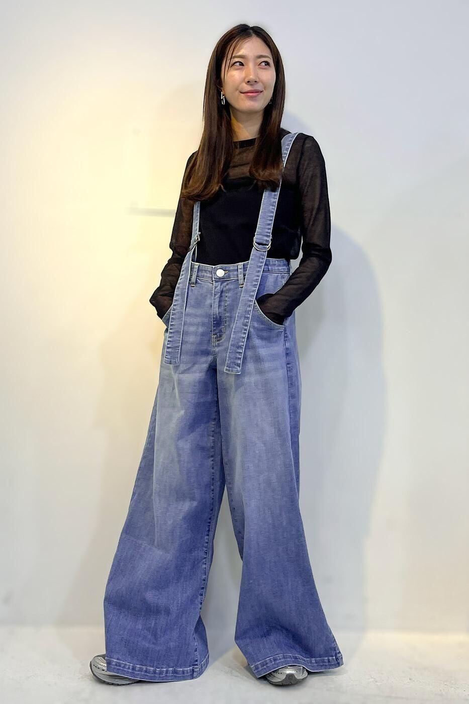 サスペンダー付ワイドパンツ。