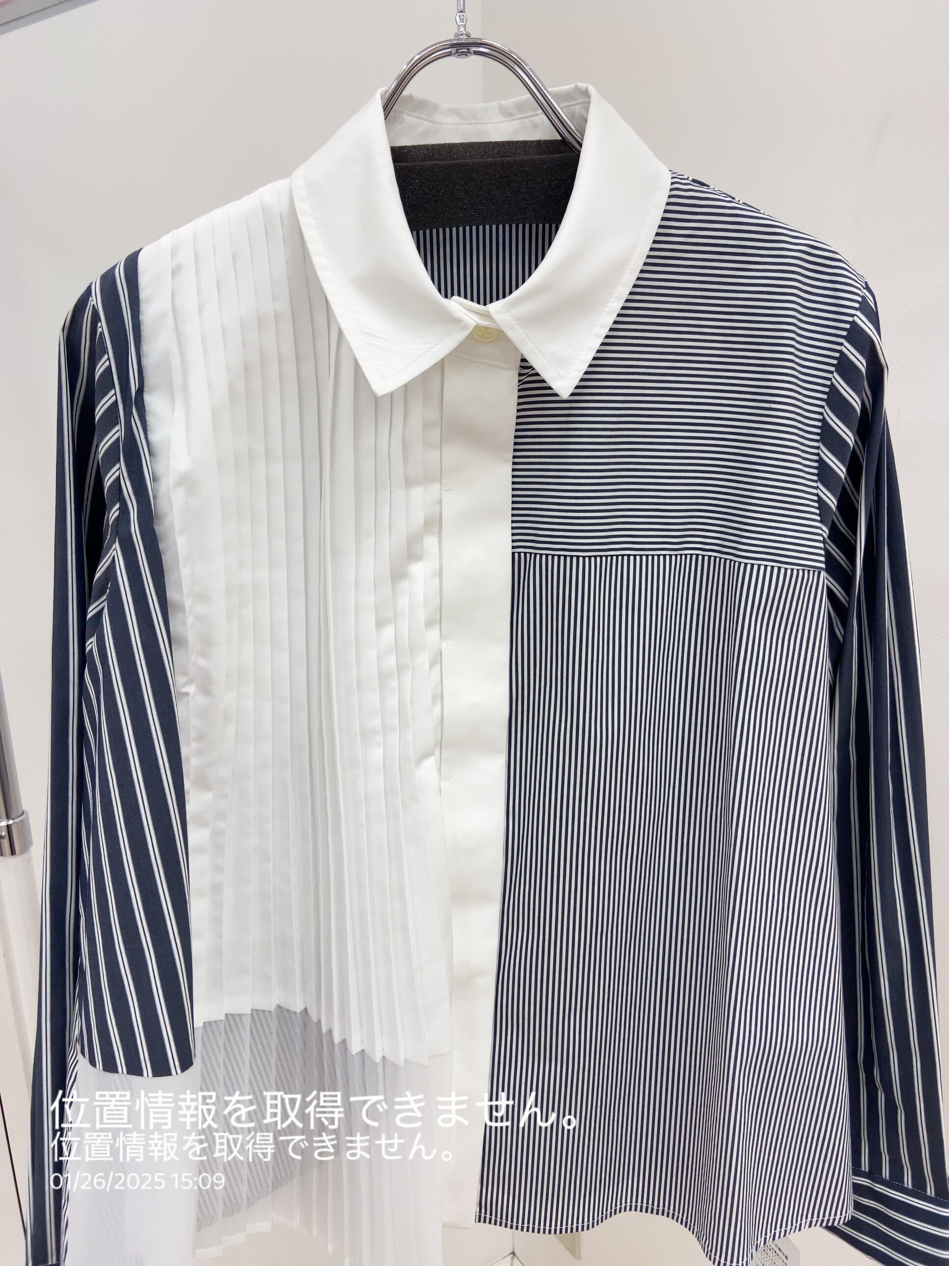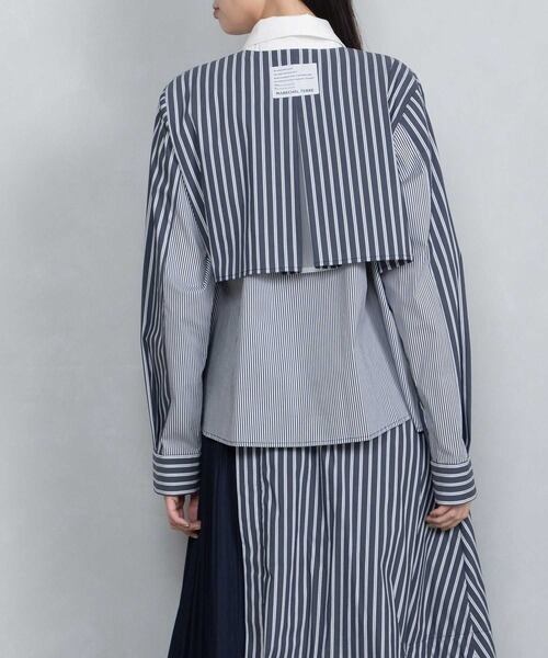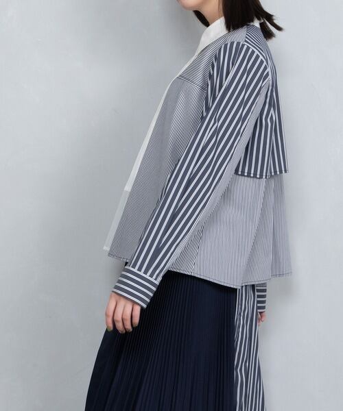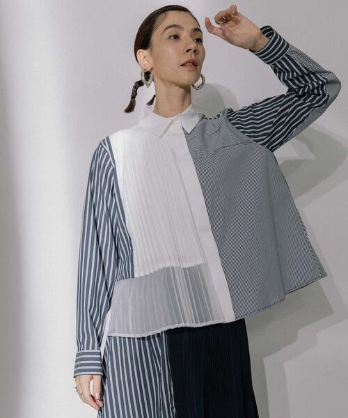 部分的にプリーツを施したストライプコンビネーションシャツ